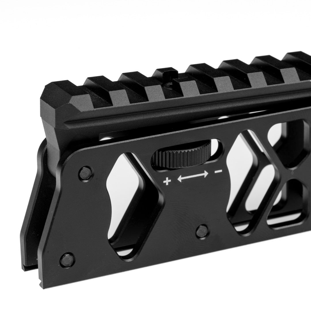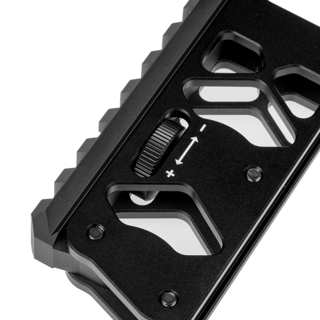 Ein integriertes Drehrad zur Verstellung der Vorneigung erlaubt eine präzise, werkzeuglose Anpassung. Dadurch lässt sich jedes montierte Visier individuell und exakt justieren – ideal für anspruchsvolle Schützen, die maximale Flexibilität und Präzision erwarten.